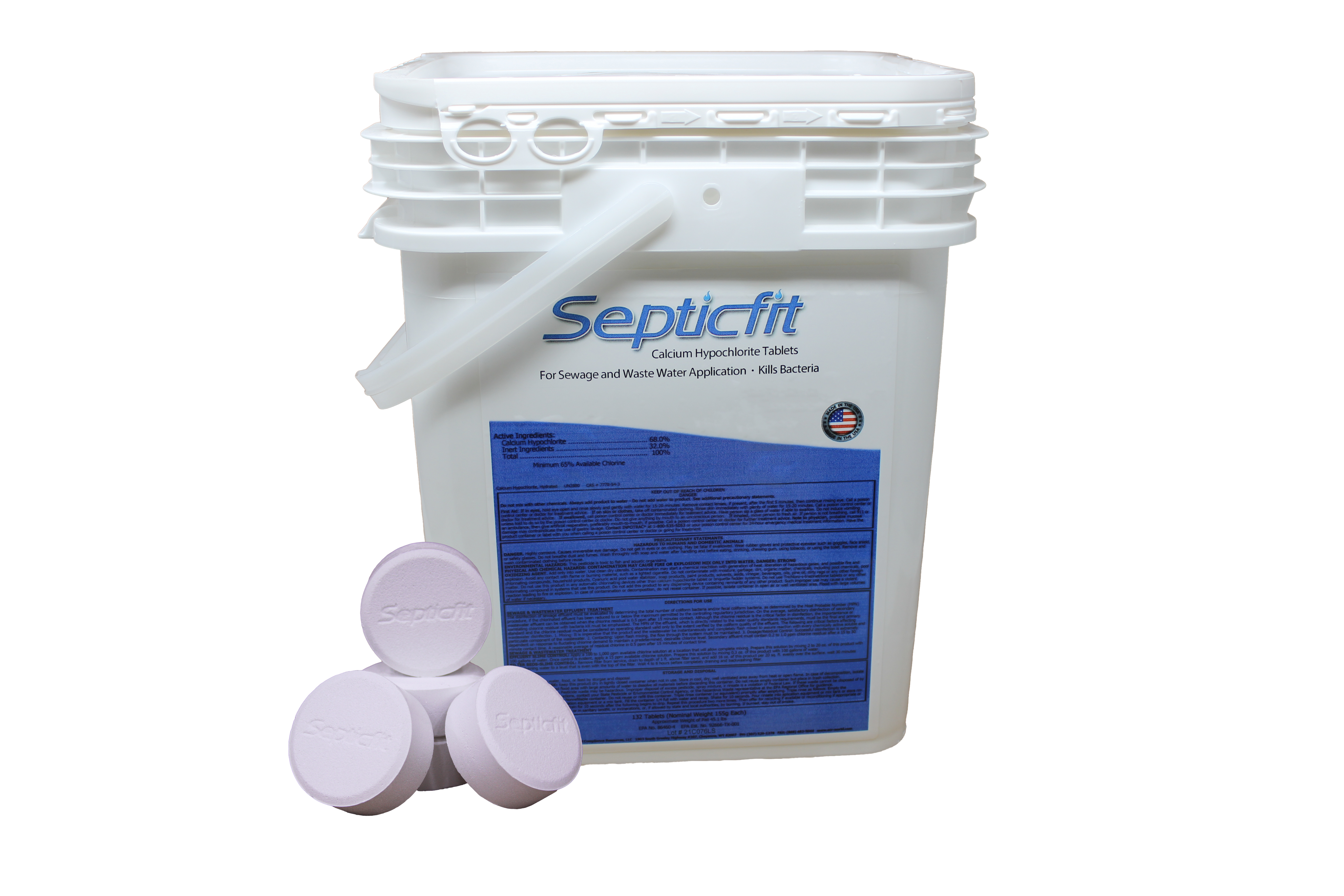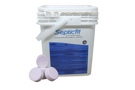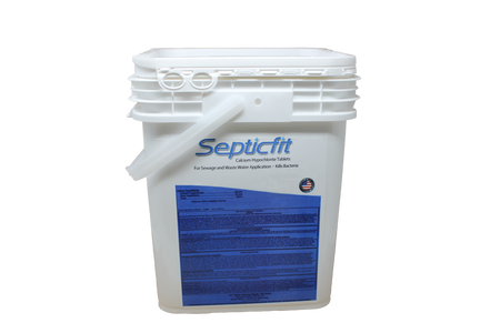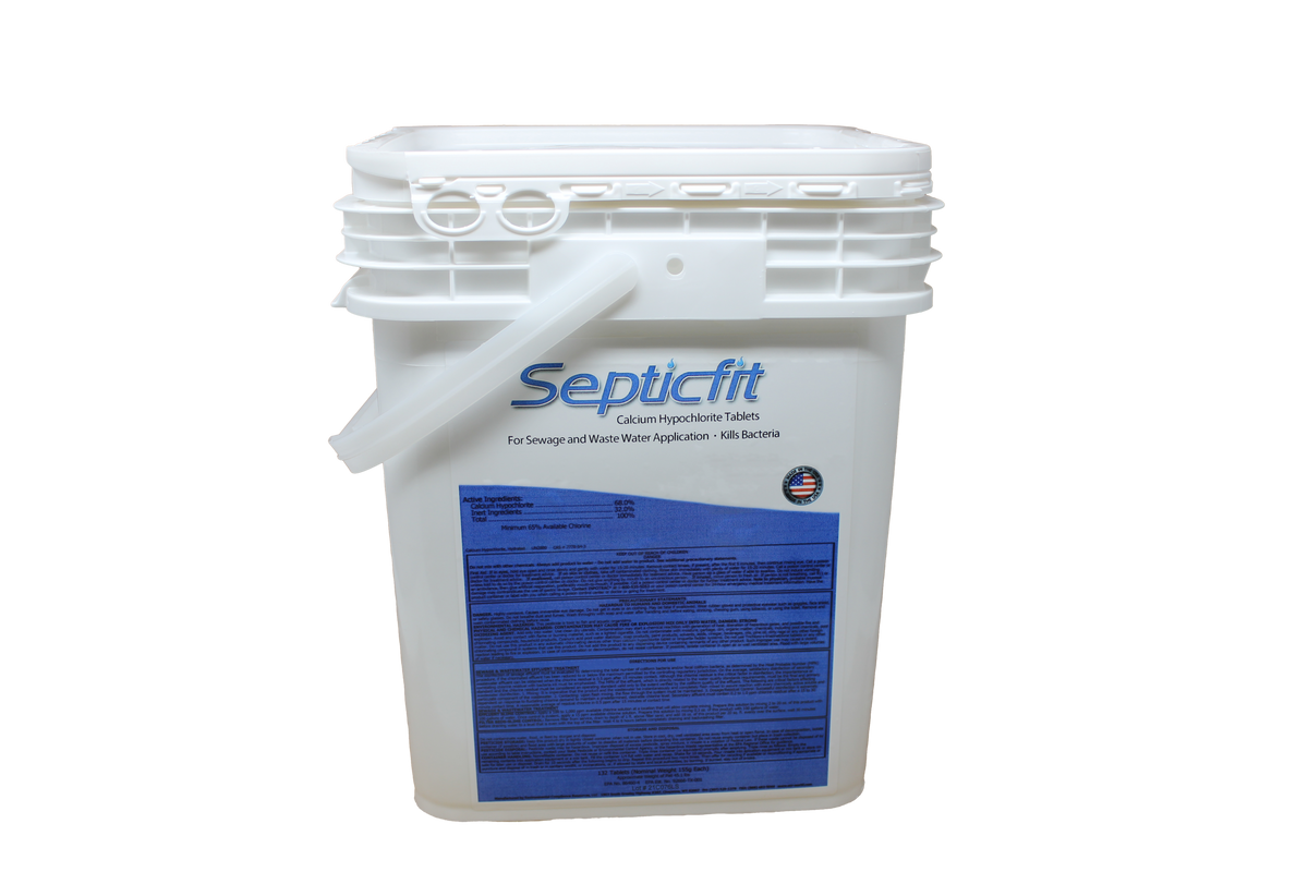 Septicfit Septic Chlorine Tablets, 132 tablet pail. These tablets are engineered with calcium hypochlorite, are specially designed for use in aerobic septic systems that have a tablet chlorinator. With its unique chemistry and size, Septicfit promises superior performance in most aerobic septic systems. Additionally, its unique additive package not only enhances performance, but also helps maintain a clean and scale-free chlorinator tube. Each pail contains 132 tablets, 45lbs.