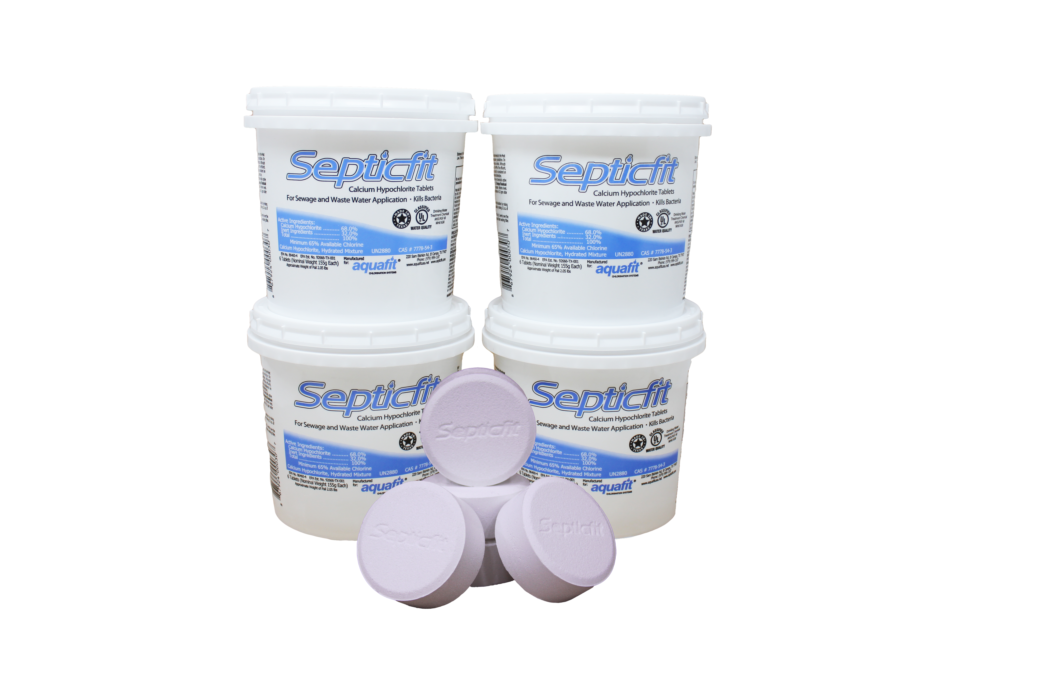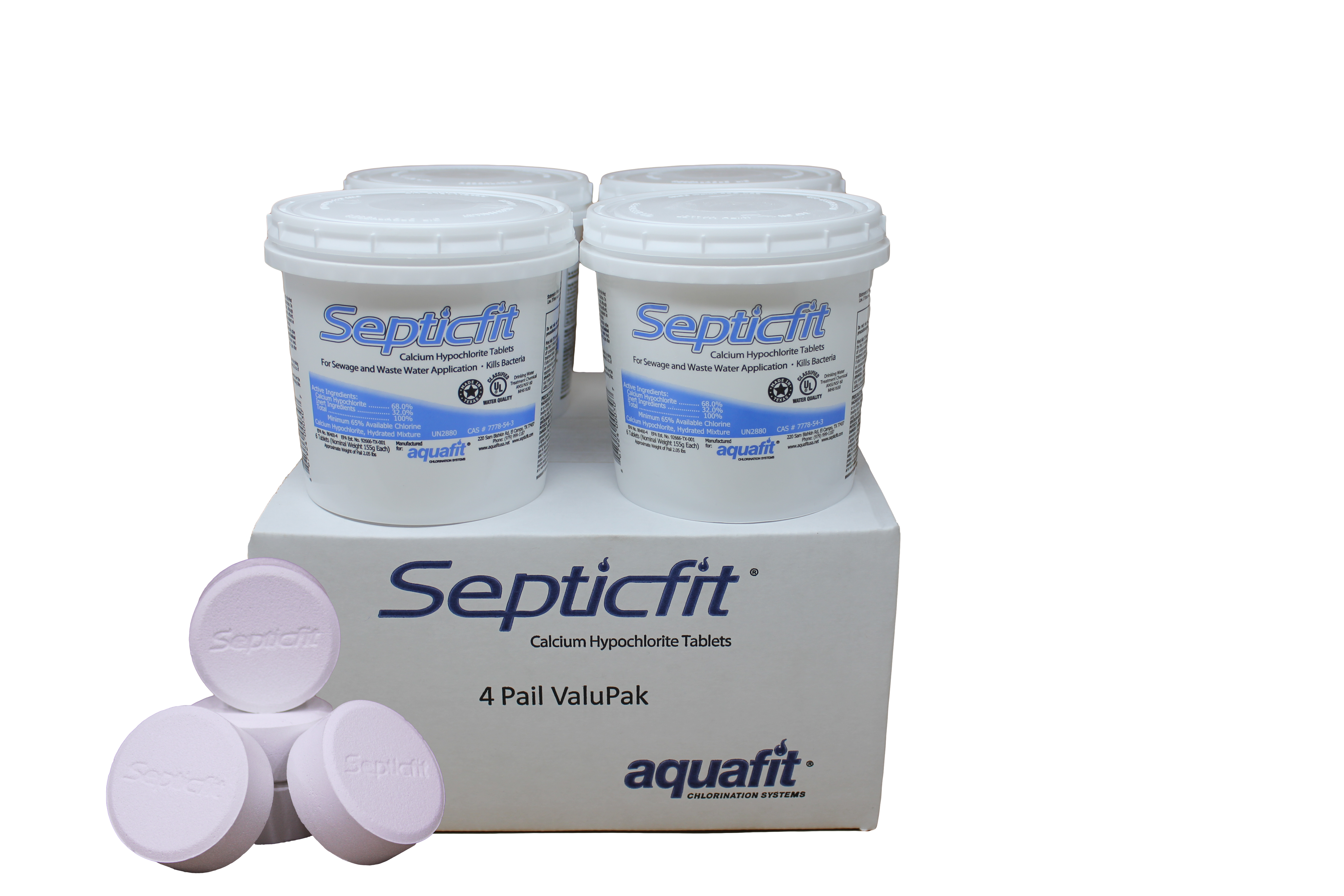 Septicfit Septic Chlorine Tablet - 4 Pail Value Pack (24 Tablets). These tablets are engineered with calcium hypochlorite, are specially designed for use in aerobic septic systems that have a tablet chlorinator. With its unique chemistry and size, Septicfit promises superior performance in most aerobic septic systems. Additionally, its unique additive package not only enhances performance, but also helps maintain a clean and scale-free chlorinator tube. Each pail contains 6 tablets, 4 pails per box.
