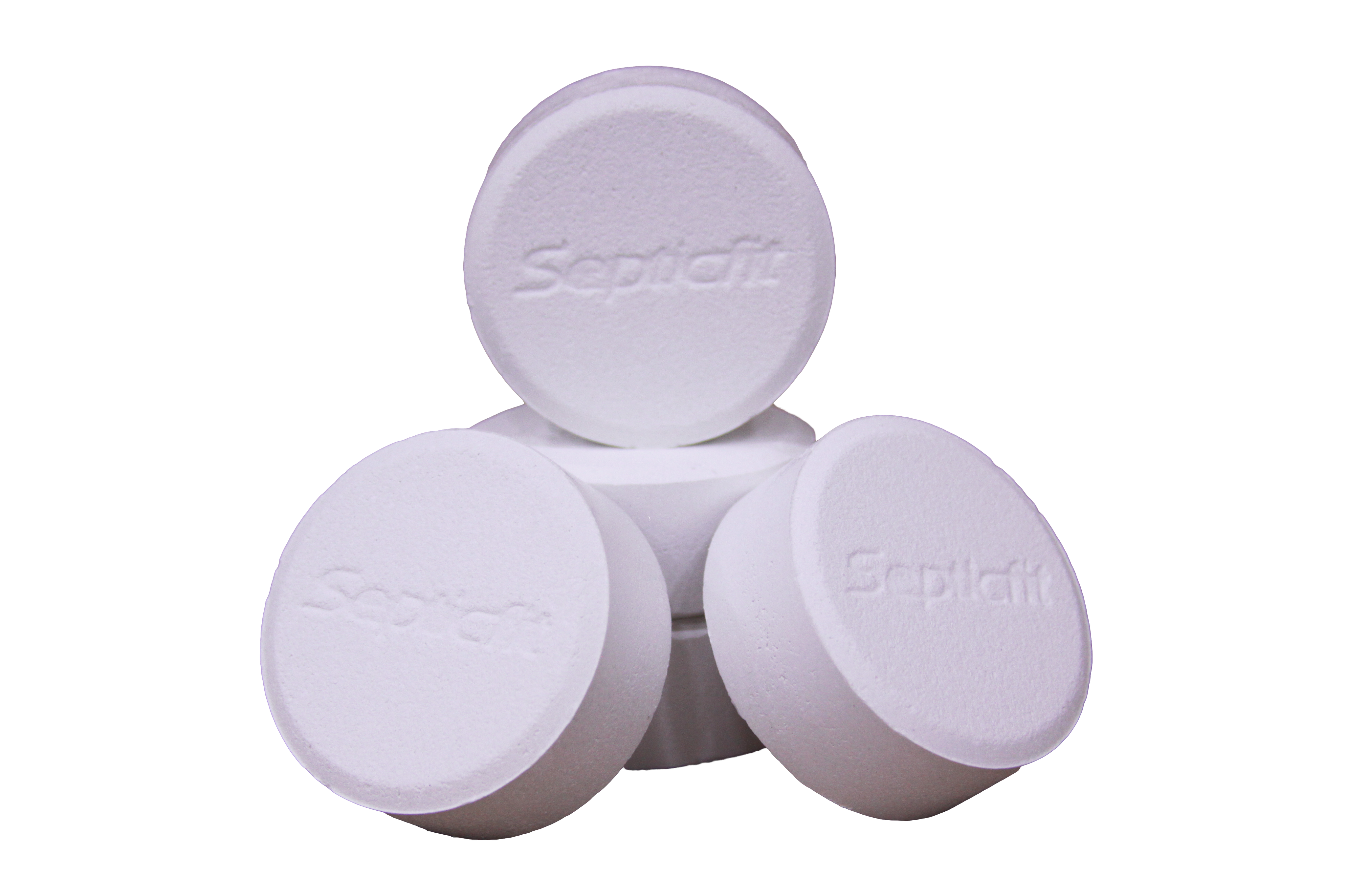 In an effort to reduce the amount of space required during storage, Septicfit tablets are packaged in the space saving superCube pails. Septicfit tablets are available in four different size to cover the needs of the septic system demands.